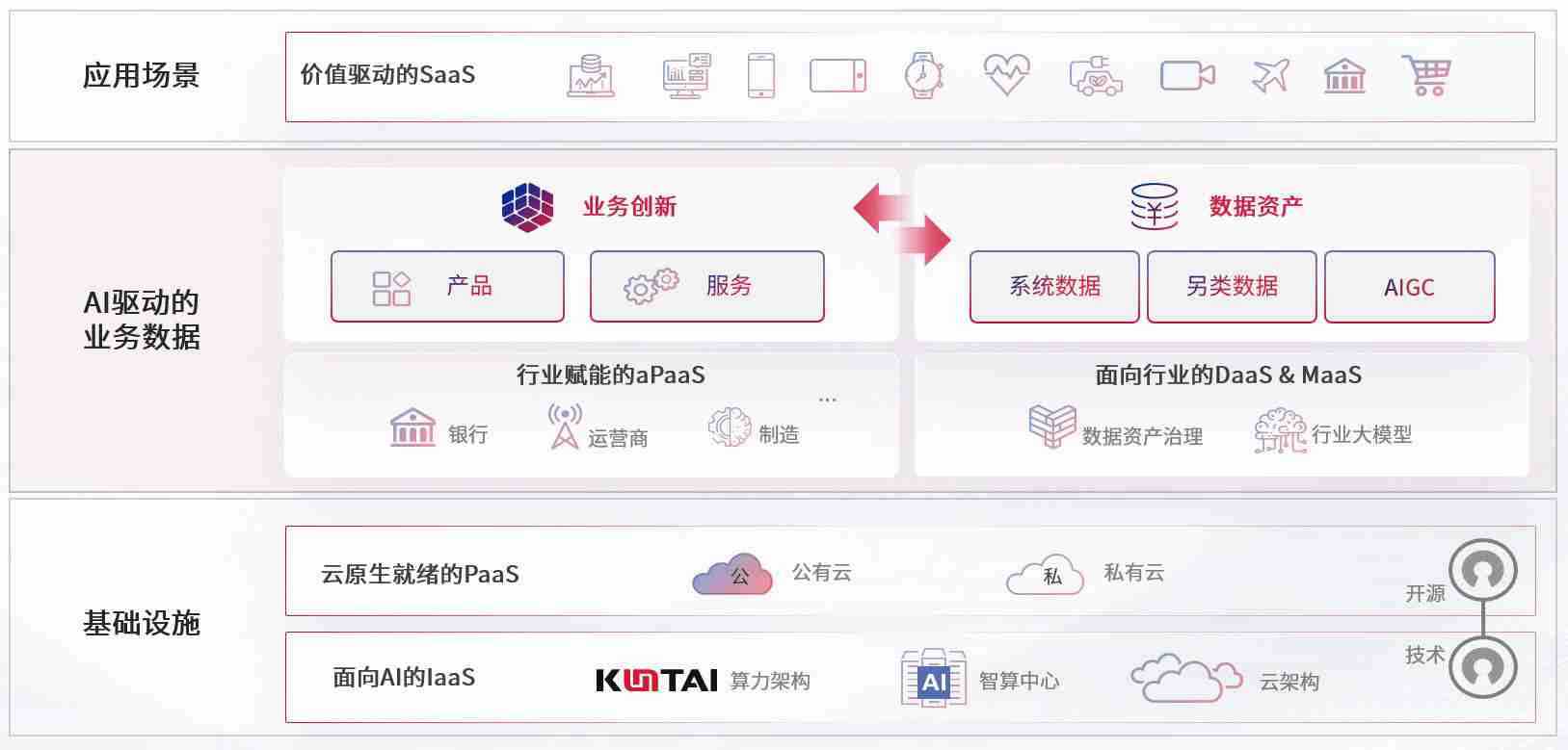 数字时代,,,,围绕企业数字化转型的关键要素,,,,亚洲必赢数码开创性的提出数云融合战略和技术体系框架,,,着力在云原生、、数字原生、、AI原生和信创产业上架构产品和服务能力,,,,为处在不同数字化转型阶段的快消零售、、汽车、、、金融、、、、医疗、、、政企、、、、教育、、、、运营商等行业客户提供泛在的敏捷IT能力和融合的数据驱动能力,,,,构建跨界融合创新的数字业务场景和新业务模式,,,,助力企业级客户建立面向未来的核心能力和竞争优势,,,,全面推动社会的数字化、、智能化转型升级。。。