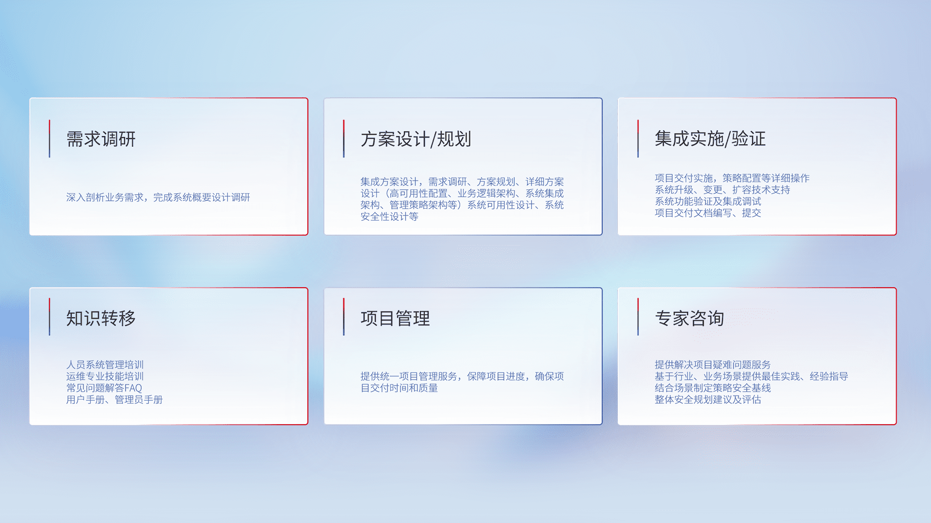针对客户行业特性,,将宏观的安全战略和需求,,通过专业的交付服务,,实现项目落地,,为客户提供标准规范的集成交付服务。。。